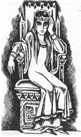 Она скинула свой плащ и села на трон. Это оказалась женщина, очень худая, с немного изможденным лицом (видимо, засчет худобы), в длинном платье и короне