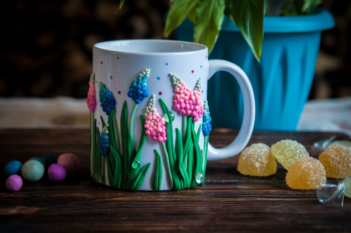 Красиво, правда? Для того, чтобы сделать такой подарок, вам понадобится полимерная глина, акриловые краски и клей. А еще - весеннее настроение, пара часов свободного времени и, собственно, кружка.