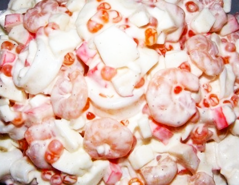 Ингредиенты Креветки 300 г Кальмары 300 г Палочки крабовые 200 г Яйцо 5 шт Икра красная 130 г Майонез Отвариваем яйца, охлаждаем, отделяем белок от желтка, нарезаем белок. Желток можно оставить для украшения. Варим креветки в слегка подсоленной воде. Затем в кипящую воду бросаем, предварительно нарезав на кольца, кальмары. Самое главное-не переварить их, иначе получатся резиновыми! Нарезаем крабовые палочки. Теперь добавляем пару столовых ложек майонеза, перемешиваем, и только потом добавляем красную икру (чтобы не полопалась). Соль-перец по вкусу, но советую солить после смешивания всего, т.к. икра и майонез могут дать достаточно соли. Приятного аппетита!