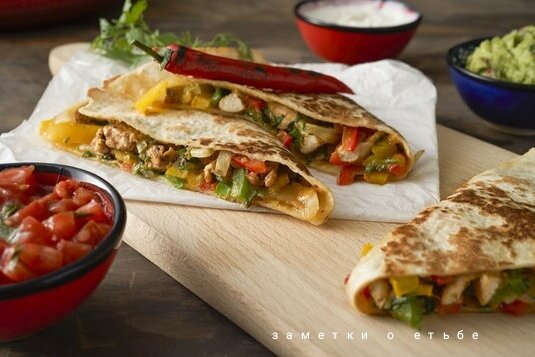 блюдо мексиканской кухни, состоящее из пшеничной или кукурузной тортильи, наполненной различными начинками. куриные грудки: 400 грамм перец зеленый :1 шт. Приправа для курицы: 1 упаковка зелень кориандра: 1 пучок лук: 2 штуки сыр чеддер оранжевый: 200 грамм перец красный:1 шт. растительное масло: 3 столовые ложки желтый перец 1 шт. соль: 3 чайные ложки тортилья пшеничная: 10 штук маринованные перчики: 100 грамм Подготовка и шаг за шагом! Итак поехали! Шаг 1 Куриные грудки, лук и перец нарежьте тонкими полосками. Нарежьте зелень кинзы, натрите на терке сыр. Шаг 2 Мясо перемешайте с солью и приправой для курицы поджарьте на сковороде, отложите в сторону. На этой же сковороде обжарьте лук и перец. Обжаренные ингредиенты, соедините с рубленой зеленью кинзы, нарезанный ломтиками, перцем и тертым сыром. Шаг 3 Готовый фарш выложите на поверхность лепешки, сложите ее пополам. Прижимая кромку, равномерно распределить начинку внутри. Лепешку с начинкой выложите на средне разогретую сковороду