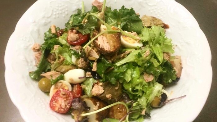 Поэтому делаем вкусный нисуаз дома. Молодую небольшую картошку режем пополам и жарим. Варим перепелиные яйца, тоже режем пополам.