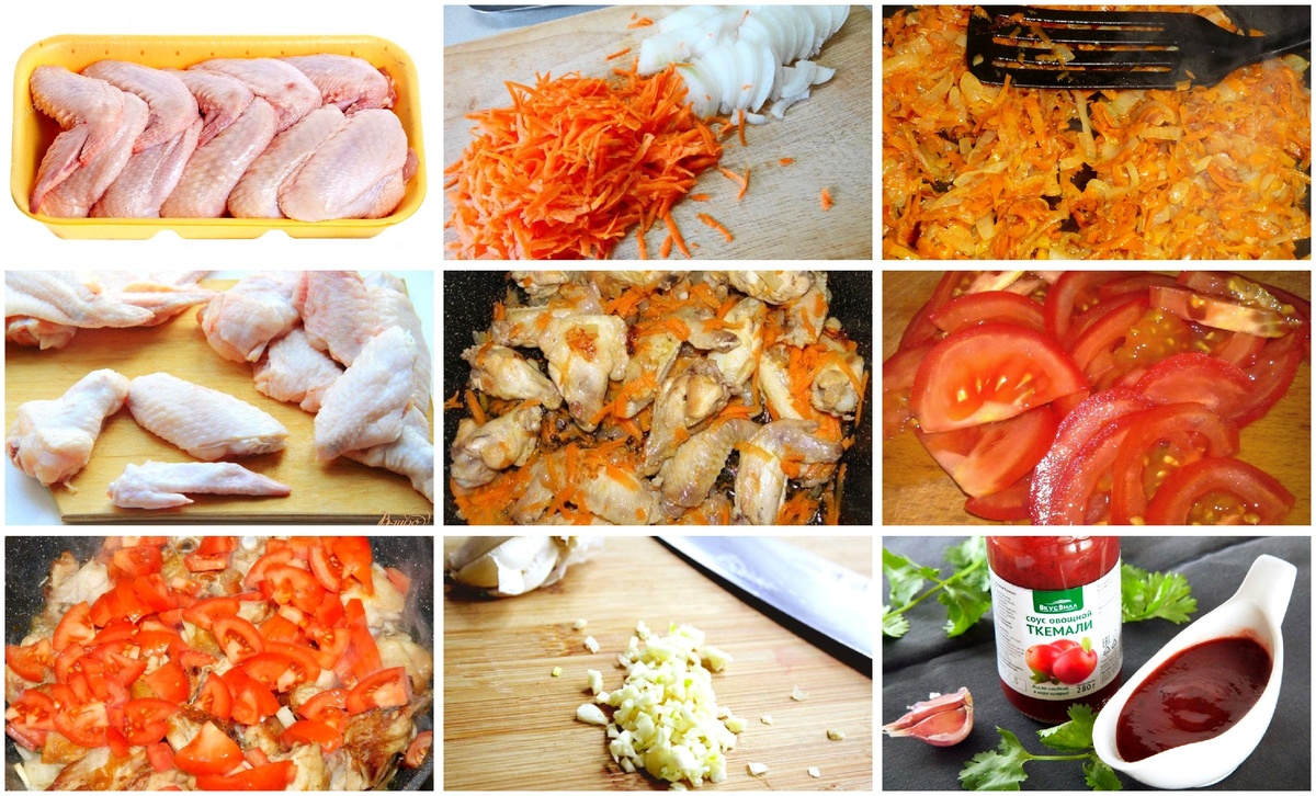 Из куриных крыльев - нежных, тающих во рту, а всего делов-то… Всё рассчитано на две подложки крыльев, ну такие корытца с крыльями, что в магазине продаются. Берём 2 большие луковицы и нарезаем тонкими полукольцами… бросаем на большую прогретую сковороду-сотейник с растительным маслом. Пока лук пассируется натираем на крупной терке 2-3 морковины и добавляем к луку. Пошел аромат, чувствуете? Крылышки куриные моем и режем на три части - плечо-предплечье-кисть и добавляем к луку с морковкой. Немного соли - конечно крупной - и огонь побольше, чтобы крылышки обжарились. Минут 5-7 перемешиваем содержимое сковороды для равномерной прожарки, убавляем огонь. Берем 2-3 помидора, моем, режем пополам, а потом каждую половину на тонкие дольки. Тут нужен острый поварской нож!… и добавляем в сковороду, солим не очень много, накрываем крышкой и даем потушиться минут 10. Как раз основная масса жидкости должна выкипеть, а затем наступает самое главное. Берем 5-7 долек чеснока, чистим его, давим ка