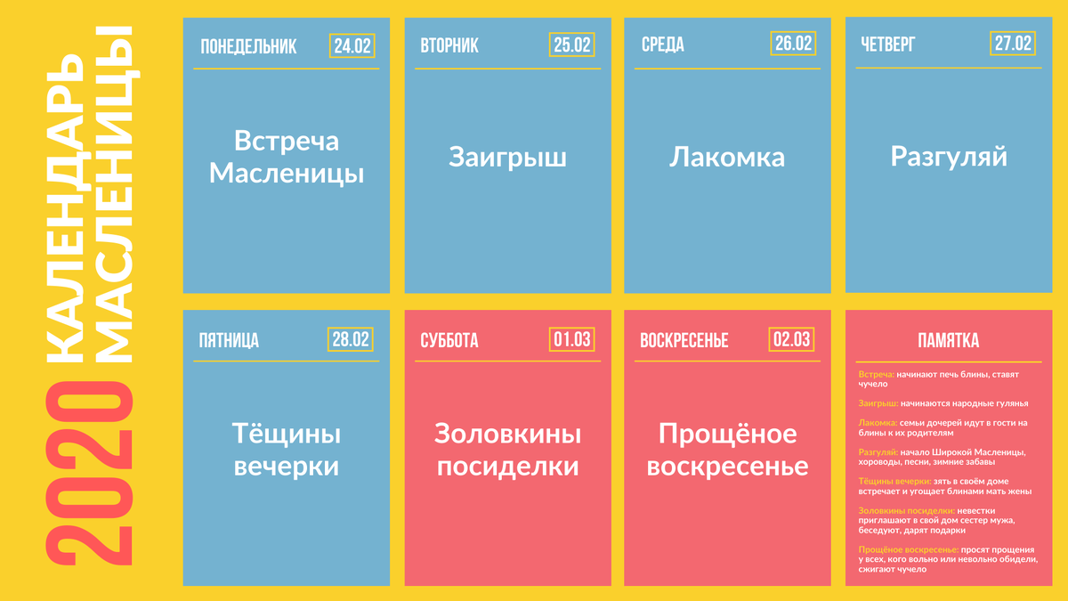 Масленицу отмечают не один день, а целую неделю, и каждый день недели имеет свое название, значение и традиции. Мы составили календарь Масленицы в 2020 году. Вы можете использовать его в качестве памятки или разместить в социальных сетях, чтобы поделиться информацией с друзьями.