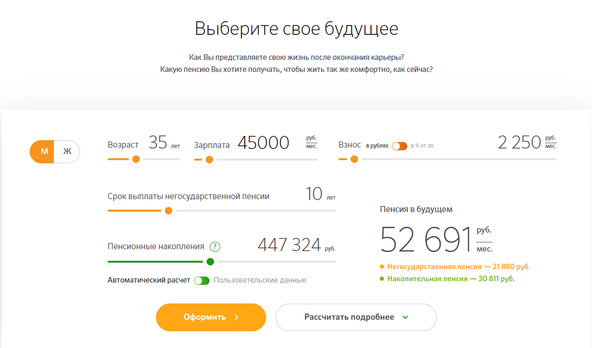 Разберёмся сначала что это такое, согласно сайту ПФР Дополнительный страховой взнос на накопительную пенсию (далее – ДСВ) – индивидуально возмездный платеж, уплачиваемый за счет собственных средств застрахованным лицом, исчисляемый, удерживаемый и перечисляемый работодателем либо уплачиваемый застрахованным лицом самостоятельно на условиях и в порядке, которые установлены Федеральным законом № 56-ФЗ. Т.е заработанные деньги частично вкладываем ради прибавки к страховой пенсии. Сколько вкладывать каждый решает сам тут свобода выбора. Дальше будем анализировать сколько мы вложим своих денег и какую прибавку получим. Заходим на сайт НПФ Сбербанка и в их калькуляторе прикидываем результат и так что мы тут получили ? расчёт ведётся для мужчины возрастом 35 лет с ЗП 45 тыс отчислять будет 2250 ежемесячно до 65 лет т.е 30 лет или 360 месяцев или 810 тыс за весь срок выплачивать сами себе пенсию планируем 10 лет или 120 месяцев Если бы мы откладывали эти деньги под подушку то прибавка