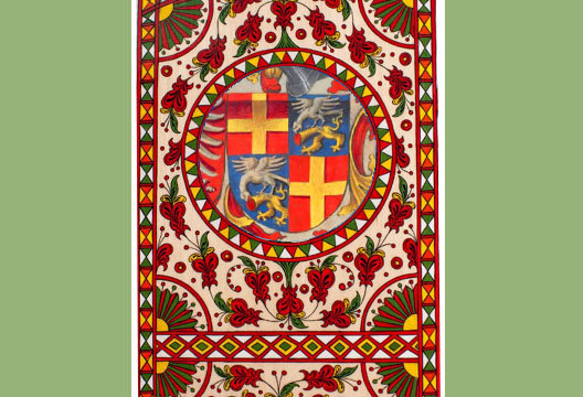 Гербы Белой Руси и Смоленской земли в обрамлении герба Великого князя Московского, Львовского, Русского и Лифляндского из "Гербовника из библиотеки графа Иоахима фон Виндхага«, 16 в.   (Kolorierte Wappenbucher aus der Bibliotheca Windhagiana). Фото – библиотека Университета Тюбингена