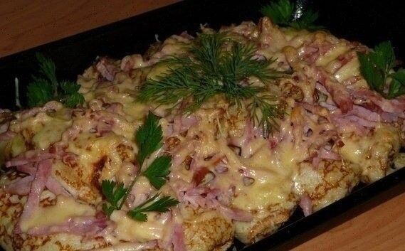 Поздравляю всех с Наступившей Масленичной неделей!!! Хочу представить Вам рецепт, по которому моя бабушка всегда делает блины на этот праздник. Обычные блинчики, умеет печь практически каждая хозяйка. Но стоит проявить немного фантазии, как они превратятся в потрясающе-вкусное блюдо, которое можно подавать на любой праздник. Ингредиенты для начинки: 150г вареного риса, 250г ветчины или бекона, соль и перец по вкусу, раст. масло, 1-2 ст.л. сметаны, чуть тертого сыра. Способ приготовления: 1. Испечь блины. 2. Приготовить начинку: вареные яица на терке + рис + зелень+сметана+ тертый сыр= все перемешать. Можно, кто любит, добавить жареный лучок. 3. Выложить по 1ст.л. начинки на каждый блин, свернуть трубочкой. Начиненные блины выложить в форму для запекания. 4. Ветчину нарезать соломкой. Сыр на мелкой терке. Выложить наблины ветчину, посыпать все сыром. Запекать 20мин. при 180. При подаче на стол украсить по желанию. Приятного аппетита! Для справки: Традиции масленицы гласят, что