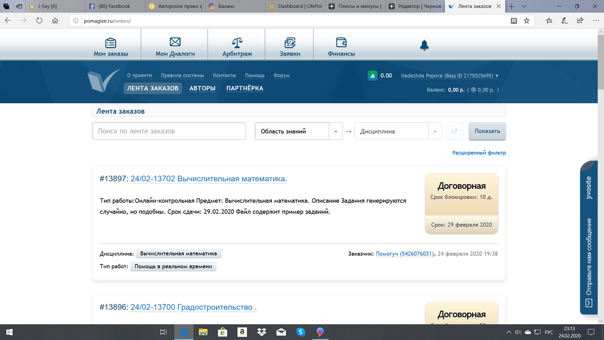 Лично я предпочитаю второй способ поиска заказов - через специальные сайты - биржи студенческих работ. Как правило, они выглядят примерно так Я считаю, что этот способ поиска заказов имеет ряд существенных преимуществ по сравнению с ранее описанным мной полностью самостоятельным (через социальные сети и т.д.). Основных два. 1. Большое количество размещаемых заказов. Большое количество подобных заказов размещается именно на таких сайтах, как видно на скриншоте. Как правило, новые заказы публикуются каждый день или даже каждый час. Следовательно, меньше времени тратится на поиск заказа. Присутствуют заказы по совершенно разным дисциплинам - от гуманитарных до технических. 2. Гарантия оплаты. На большинстве подобных сайтов предусмотрена функция гарантии оплаты. После того, как заказчик выбрал вас исполнителем заказа, на его счету замораживается определённая сумма денег (стоимость заказа), после выполнения работы (на некоторых сайтах - после истечения гарантийного срока, в течение которог