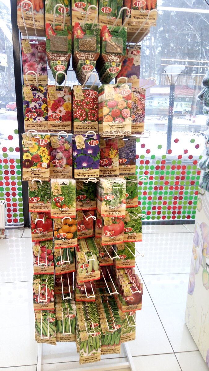 Пятёрочка тоже хочет подготивить нас к огородному сезону и вот, что нам предлогают. Выбор семян здесь очень радует, цены тоже не особо кусаются. Помидоры, зелень, редис, перец, кабачки по 7 р. упаковка. Огурцы, горох овощной, цветы, морковь по 12 р. упаковка. Грунт для рассады 5 л. 30р. Корзина для луковичных 55р. Набор инструментов: совок, лопатка, грабли 100р. Стимулятор корнестим 10гр. 35р. Ороситель на 1,5 л. 250 р. Здесь субстракс кокосовый в брикете стоит уже 100р. Бордюрная лента 250р. Кассета и поддон для высадки растений 100р. Торфяные горшки для рассады от 54р до 69 р. Вообще есть что посмотреть, в особенности понравился обширный выбор семян разных овощных культур и цветов.
