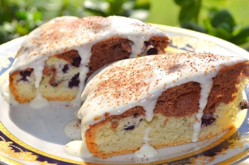 Яйца взбить с сахаром в очень пышную массу, добавить соду и постепенно муку. 2/3 теста вылить в форму, в остальное тесто добавить какао. Поверх белого теста выложить ягоды, обваленные в муке, и темное тесто хаотично. Печь при 170-180* 20-30мин (проверить спичкой). Для крема перемешать сметану с сахаром и оставить до растворения сахара. Корж остудить, можно разрезать и пропитать, промазать кремом, я просто сверху полила.