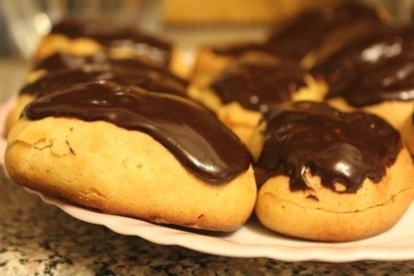 ИНГРЕДИЕНТЫ: ● Молоко – 1 стакан (250 мл). ● Масло сливочное – 100 гр. ● Мука – 150 гр. ● Соль – щепотка. ● Яйца – 4 штуки. ПРИГОТОВЛЕНИЕ: В кастрюлю налить молоко, положить туда масло сливочное, щепотку соли. Масло хорошенько растопить и добавить просеянную муку постоянно перемешивая, заварить массу и снять с плиты. Затем взбивая массу по одному добавить яйца. Я яйца добавляла сразу в горячее тесто. Готовую массу наполнить в кондитерский мешок или шприц, и выдавить полоски длиной 10 см. на смазанный маслом или постеленный пергаментом противень. Между полосками оставить расстояние 5 см. У меня эклеры выпекались в разогретой духовке при 180 гр 30 минут (у Лены по рецепту всего 15 минут). Духовку при выпекании эклеров не открывать. В готовых эклерах делаем отверстие и наполняем заварным кремом, сверху эклеры покрыла растопленным на водяной бане шоколадом. Заварной крем: ● 400 мл молока, ● 2 желтка, ● 1,5 ст.л. муки, ● 1,5 ст.л крахмала, ● 80 гр сахара, ● ванилин В посуде для микроволно