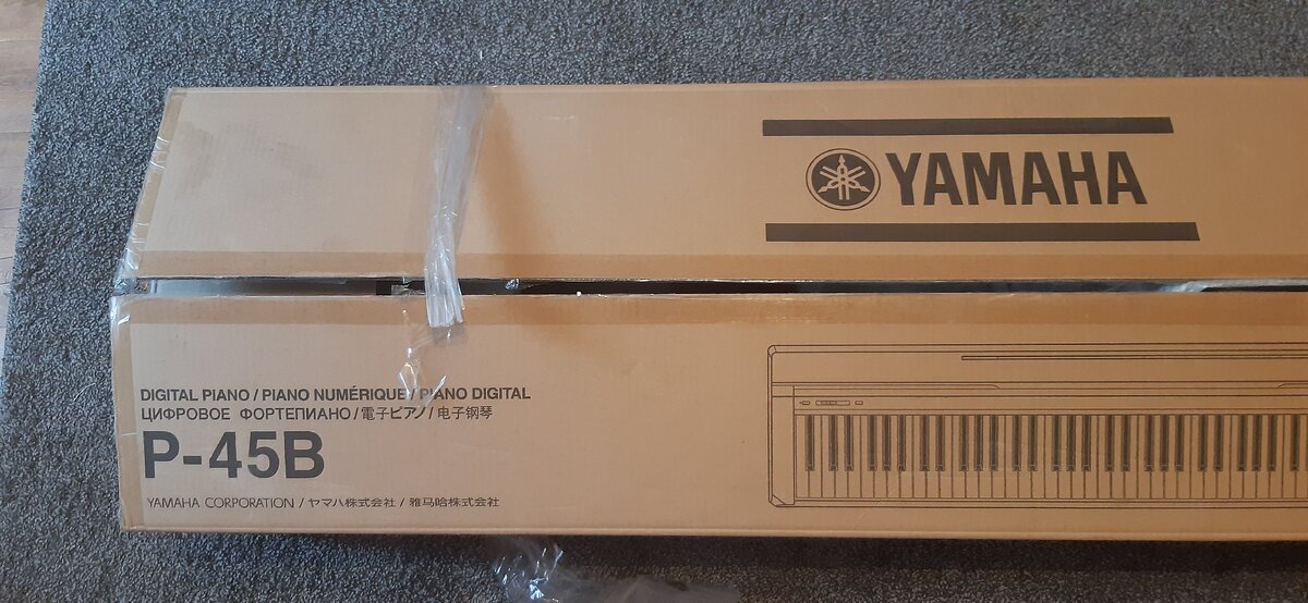 Приобрели вчера ребенку цифровое фортепиано Yamaha P-45. Сразу скажу, коробка большая, тяжелая, лучше оформлять доставку, чтобы потом не мучиться. Высота коробки около 160 см и она обьемная. Само пианино упаковано хорошо, волноваться не стоит, что оно повредится в дороге. Вот и само пианино. У нас пока стоит на табуретах. Пианино весит 11,5 кг, его габариты - 132 см. на 29 см. на 15 в см. Имеет оно 88 клавиш, с 4 уровнями чувствительности клавиш к силе нажатия, молоточковый механизм (самые главные характеристики при выборе пианино). Пианино имеет 10 встроенных тембров, 4 типа реверберации, режим Dual и Duo, 64-нотную полифонию. В комплект входит педаль сустейн, пюпитр, блок питания, инструкция. Пианино имеет несколько тембров, тембр концертного рояля, яркий, классический и электрический звук фортепиано, несколько тембров органа, вибрафон. Переключение тембров осуществляется с помощью кнопки Grand piano и клавиш. Управление несложное. Функция Duo позволяет играть 2 исполнителям сразу
