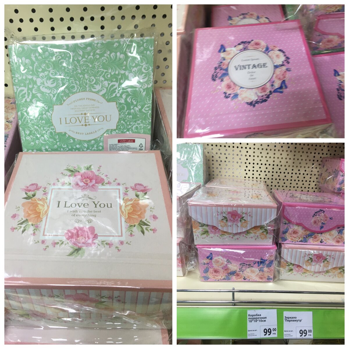 Добрый день, дорогие друзья! Пошла сегодня за бытовой химией и за одно решила сделать обзор новинок. Полки, как всегда, переполнены интересными товарами. В первую очередь бросается в глаза стеллаж с подарками к 8 марта. В нашем магазине он уже почти пустой, остались вот такие очень милые подарочные коробки стоимостью 99 рублей. Есть подарочные наборы куда входят: зеркало винтажные, брелок и ручка. Неплохой вариант для подарка подругам или коллегам на работе. Думаю стоит обратить внимание. Интересные и оригинальные кашпо для комнатных цветов. Кому надоели пластмассовые горшки стоит обязательно купить такие. Новые шкатулки, видимо к 8 марта завезли. Прочные и качественные. Обклеены стразами и бисерами, на любителя, но смотрятся мило. Подарочный набор конфет. Обязательно стоит купить, всегда пригодятся, хоть на подарок или как гостинцы. Красиво упаковано, 50 рублей всего лишь. Заметила вот такие шкатулки в виде машины: Новые led ночники-светильники. В виде мишки особенно покорил сердце