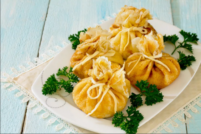 Шаг 12. Края поднимаются к верху и при помощи ниточки сыра сулугуни, завязываются таким образом, чтобы сформировался мешочек.