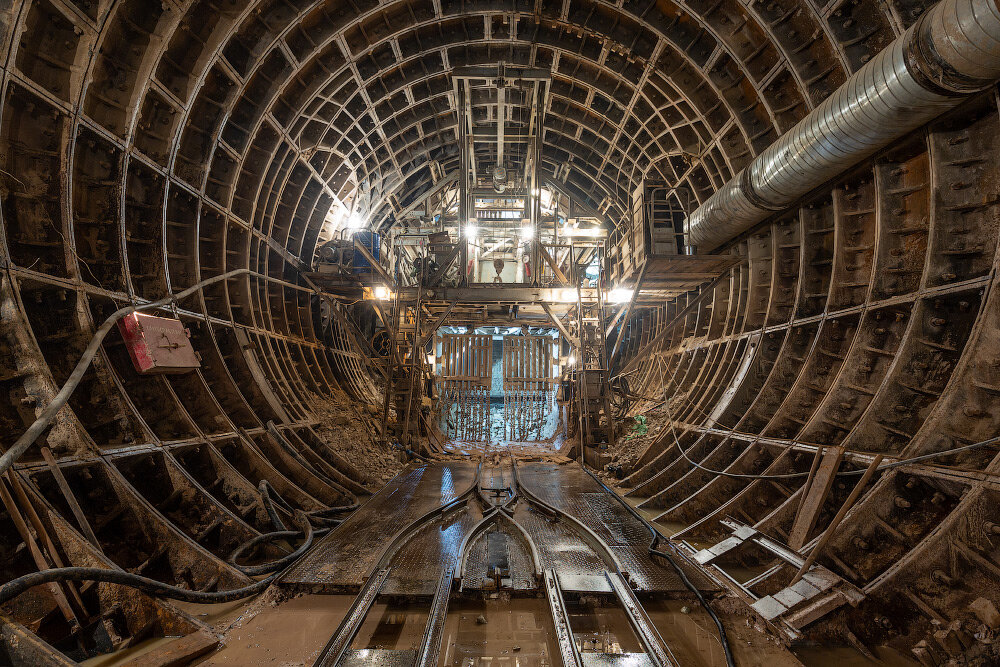 1. Станция «Марьина Роща» БКЛ строится из двух стволов: №946, который остался от сооружения ЛДЛ, и нового, имеющего номер №1238бисК. Начнем с первого. После длинной подходной (более 1 километра!) попадаем к развилке, где можно спуститься в слепой ствол — там сооружают центральный зал станции.