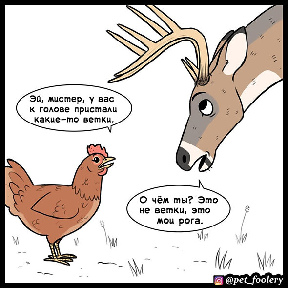 Животный мир необычен и очень разнообразен! Разные виды животных могут похвастать крутыми и необычными особенностями - например, ящерицы способны отбрасывать свой хвост, а затем отращивать новый; зрение орлов настолько хорошее, что они могут заметить добычу с расстояния в 3 километра; а у оленей прямо на голове растут огромные и статные рога! Талантливому художнику и большому любителю животных - Бенджамину Хеду - однажды стало интересно, почему и зачем на головах оленей появляются эти штуки. Бен решил нарисовать забавный комикс об оленьих рогах - и конечно же, добавить в эту историю немного юмора и своего фирменного стиля рисования! Бен придумал и нарисовал весёлый и очень необычный комикс о милом олене, которому пришлось объяснять происхождение своих рогов крайне необычному собеседнику. Этот комикс меньше чем за сутки собрал больше 350 тысяч лайков на Instagram странице Бена - @pet_foolery - забавная ситуация и диалоги очень понравились любителям комиксов! Мы перевели этот весёлый ком