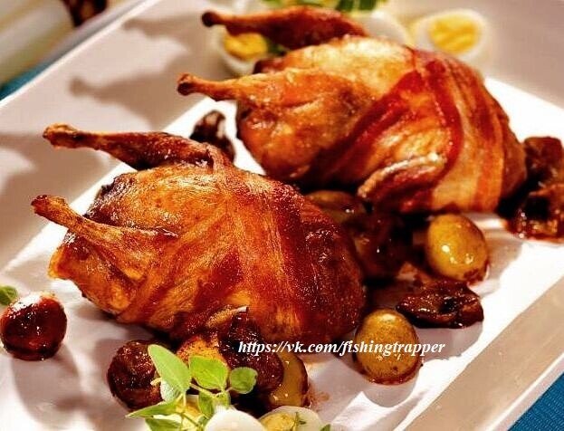 Если вы не знаете как приготовить перепела так чтобы их было не стыдно подать на банкет, то этот простой рецепт решит вашу проблему. Сочные перепела фаршированные мармеладом (или грейпфрутовым джемом), виски и беконом, запеченные в духовке и поданные на подушке из жареного картофеля с яблоками и грушами не оставят равнодушным ни одного гостя.