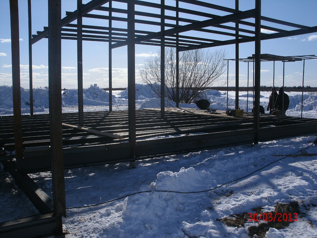 Друзья, продолжаю вспоминать и описывать хронологию работ при строительстве этого дома. Но с началом возведения каркаса дома, был произведён заказ сэндвич-панелей, так как они должны были стать основной ограждающей конструкцией стен. Панели заказывались на заводе металлопрофиль. Сэндвич-панель с минераловатным утеплителем толщиной 200мм. Так как дом был запроектирован с односкатной кровлей, то панели потребовались всего двух размеров, одной длинны по трём сторонам и другой по третьей стороне, куда был скат кровли. А на стройке продолжали собирать каркас будущего дома. Основанием для нулевого перекрытия и перекрытия первого этажа служил швеллер №10, который клался на двутавр №18 ввареный между стойками каркаса. Для того, чтобы было удобно ходить по каркасу использовалась доска 50мм толщиной, которая в последствии вся ушла в устройство нулевого перекрытия и кровли.