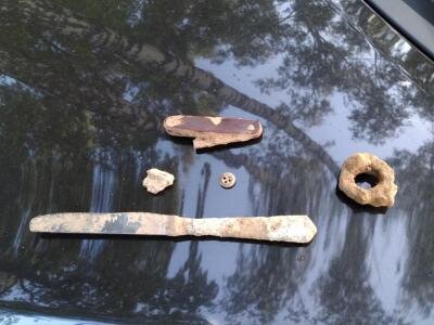 Как-то в августе прошлого года в будни рано утром пишет мне начальник мой что на работу мне не к первой смене а к вечеру.Ну думаю раз есть свободное время да и погода хорошая с утра,пойду пройдусь по соседним лесам с МД.Первое что нашёл это маленький складной нож,лежал под землёй сантиметров 10,иду дальше и вот она вторая находка тоже нож только столовый.Думаю сегодня день ножей какой-то,но нет в дальнейшем находки были совсем не ножи))),нашёл кусок трубы диаметр наверно 100,иду дальше опять труба водопроводная с краном.Всё таки трубный день))).В дальнейшем хорошо зазвенело думаю ну на конец-то что-то интересное,три раза уронил из рук пока выкапывал и вот она,маленькая пуговица.На этом я себе сказал что хватит на сегодня лес очищать от безценного металла.Поехал домой отмывать находки.Трубы которые нашёл на чермет пойдут,остальное в ящик с находками.Всем удачных ценных находок под катушку и хорошего настроения!