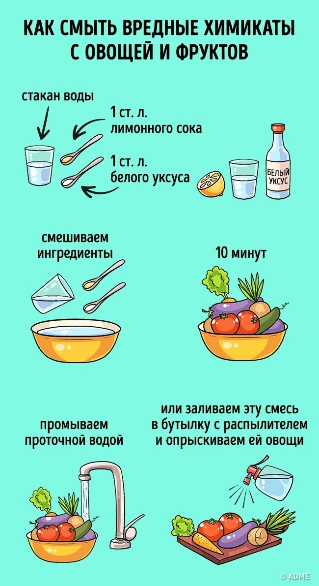 Сейчас сложно встретить продукты, которые выращивались бы без использования химикатов. Они защищают растения от разного рода вредителей и болезней. Но для человеческого организма пестициды тоже вредны, ведь, по сути, это яды. К счастью, химикаты скапливаются на поверхности плода и редко попадают внутрь.Я подскажу вам решение, с помощью которого вы сможете избавиться от 98 % вредных химикатов на продуктах. Вариант № 1 Еще более простой и эффективный способ — налить эту смесь в бутылку с распылителем и опрыскать ею овощи или фрукты, а через 10 минут смыть смесь с продуктов обычной водой. Вариант № 2 Также возможен вариант очистки при помощи бутылки с распылителем, как в первом случае. «Грязная десятка»