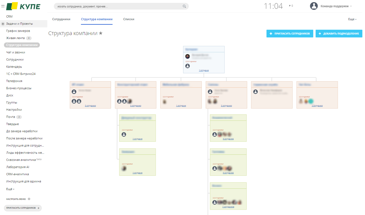 - Создание сотрудникам на портале учетных записей и распределение по отделам и подотделам