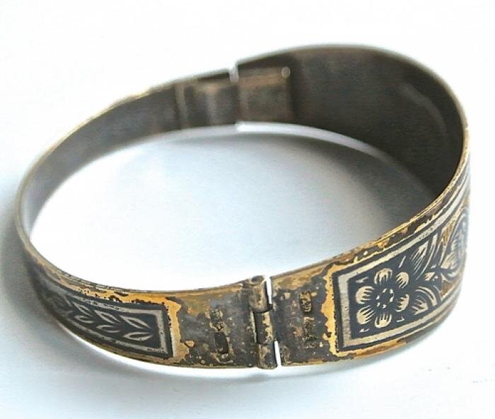 Красивые гравированные с чернью посудные изделия и браслеты - были прекрасным подарком на праздник! Это была истинная роскошь. Все берегли такие вещи. Но они быстро чернели и покрывались налетом. Позолота от чистки облезала. Но все равно эти вещи хорошие и не устарели. Берегите их, гравировка и нанесение черни было вручную- а это ценно. Великоустюжский завод «Северная чернь» С середины 19 века черневое дело в Великом Устюге приходит в упадок -местные изделия не могут конкурировать с относительно дешевыми серебряными изделиями промышленного производства Москвы и Санкт Петербурга. Возрождение технологии черни, сложной, требующей большого опыта и навыков, началось в 30-е годы прошлого века. Объединившись в 1933 году в артель, которой руководил потомственный мастер М.П. Чирков, великоустюжские ювелиры начали изготавливать простые, но достаточно разнообразные изделия: подстаканники, стопки, пудреницы, ложки и ювелирные изделия с цветочным орнаментом или тематическими композициями.