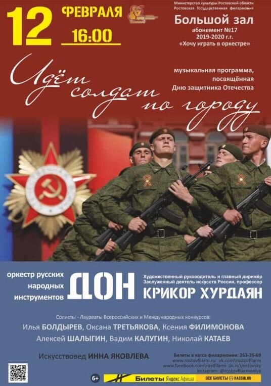 Возвращаюсь Люблю когда интересные события повторяются, когда возвращаюсь в места где мне было хорошо. Ростовская филармония это моё личное "место силы". Как же хорошо, что два месяца подряд я посещаю концерты оркестра «Дон». Помимо того что я получаю невероятное удовольствие, я беру с собой 5-летнего сына и делаю пусть и не большой. но вклад в его развитие. Шел солдат... В этот раз мы побывали на концерте: «Шел солдат по городу...» - это был концерт патриотической направленности. К сожалению сейчас этот вопрос поднимается лишь только накануне 9 мая. Концерт состоялся 12 февраля, в преддверии 14 февраля ведь для ростовчан это день освобождения Ростова-на-Дону от немецко-фашистких захватчиков. Не много истории 14 февраля исполнилось 77 лет с того знаменательного дня, как в 1943 году был освобожден от гитлеровских захватчиков Ростов-на-Дону. «Ворота Кавказа» оккупировались гитлеровцами и их союзниками дважды. Первый раз, осенью 1941 года, гитлеровцы смогли захватить Ростов всего на нед
