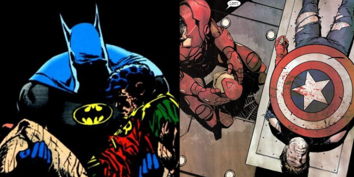 У Супермена и Капитана Америки есть некоторые сходства, такие как альтруизм и честность, что делает смерть Кэпа довольно значимой во вселенной Marvel. После долгой и тяжелой битвы в гражданской войне Стив Роджерс сдался и был готов выполнить регистрацию супергероя. Но он был убит убийцей, пока позже не выяснилось, что Шарон Картер, которому промыли мозги, был тем, кто его застрелил. Его смерть оказала довольно большое влияние на других героев вселенной Marvel, например, Росомаха, готовая пойти на мстительную охоту, чтобы найти убийцу Кэпа. Это также в конечном итоге привело к тому, что Баки Барнс взялся за щит и принял мантию Капитана Америка.