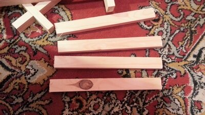 Быстренько разобравшись с оставшимися рисо-рыбными закусками, воодушевленный рванул в ближайший строительный магазин, где были приобретены: три двухметровые планки сечением 2х3 см, бумага для запекания, декоративно-защитный состав для древесины (аля-морилка). Далее стопы направил домой, где для реализации идеи были извлечены из недр балкона ножовка, стусло, рулетка, карандаш, канцелярский нож, старая стамеска, суперклей и кисточка.