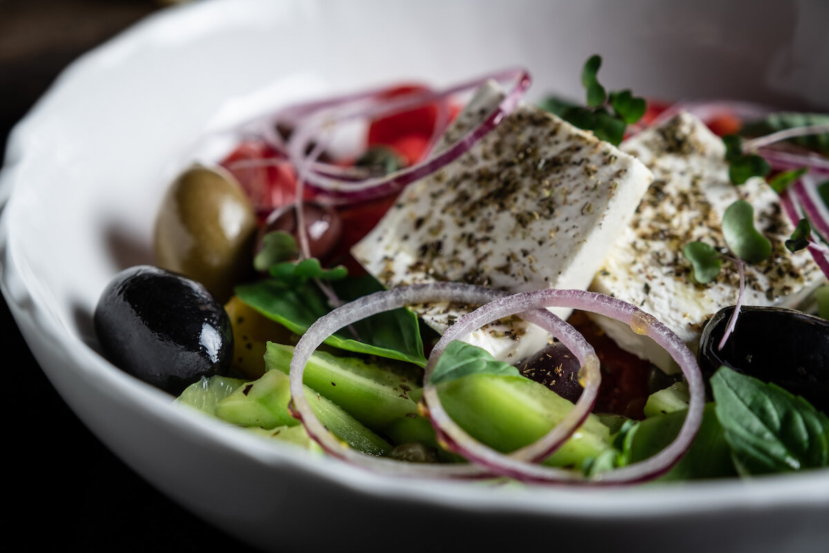 - На дно тарелки влить греческий йогурт, выложить овощи, залить оливковым маслом, выложить брынзу, посыпать орегано и луковыми кольцами.