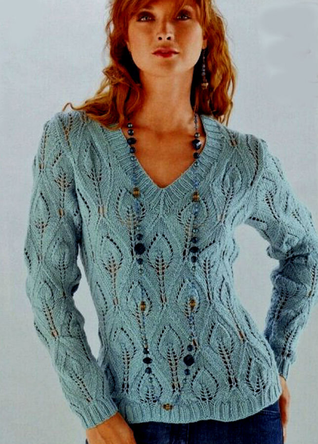 №1 Пуловер с узором листики Выкройка Схема Описание: Вам потребуется 500 г. пряжи (50% акрила, 30% шерсти и 20% шелка), спицы №4, крючок №3. Спинка. Наберите 78 п., и вяжите резинкой 2х2 - 4 см. Затем вязать по схеме: кромочная петля, 19 п. раппорт повторить 4 раза + 1 кромочная петля. Вяжем 35 см и производим убавление для вырезов под рукава с 2 сторон в каждом 2 ряду по 1 п., всего 5 раз. Оставшиеся петли закрываем. Полочка. Наберите 78 п., и вязать резинкой 2х2 - 4 см. Затем вязать по схеме: кромочная петля, 19 п. раппорт повторить 4 раза + 1 кромочная петля. Вяжем 35 см и производим убавление для вырезов под рукава с 2 сторон в каждом 2 ряду по 1 п., всего 5 раз. Для формирования выреза горловины закрыть 4 средних петли через 37 см от начала вязания и произвести убавление следующим образом: во 2 ряду - 1п., в 3 р. - 4п., в 4р. - 1п., в 5р. - 3п., в 6р. - 1п., в 7 р. - 2п., в 8 р. - 1п., в 9 р. - 3п., в 10 р. - 1п., в 11 р. - 4 п., остальные ряды вязать без убавления 20 см. Зак