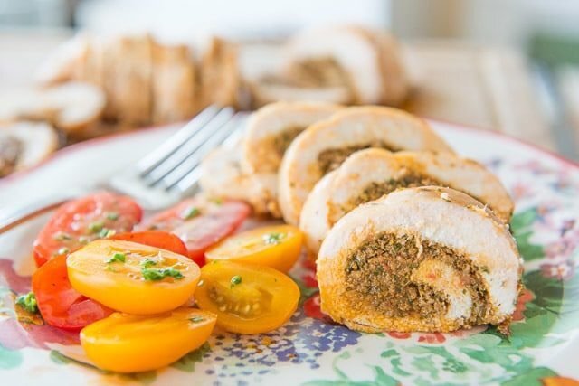 Куриный рулет с вялеными помидорами, базиликом и грецким орехом