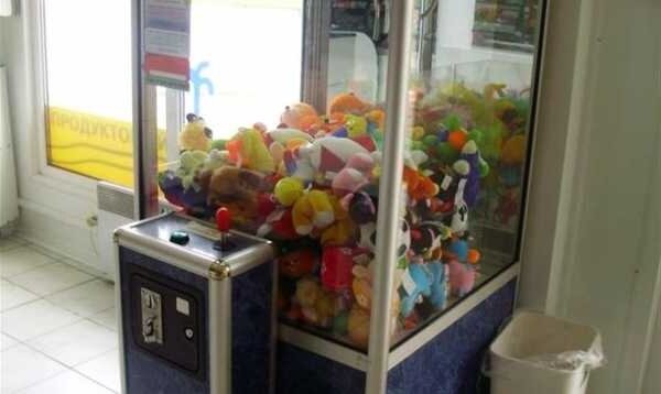 И снова здравствуйте. И снова автоматы. В прошлый раз я рассказывал вам как достать приз из автомата с выталкиванием телефонов, а сейчас будем обсуждать мягкие игрушки. Каждый натыкался на такую вещь, и многие из вас пробовали достать игрушку используя ловкость рук. Игрушку нужно схватить крюком, а дальше если повезет крюк протянет её к вам. Стоимость одной игры 5 рублей, бывает 10. Вытащить игрушку получается не так уж и часто. В основном кран хватает её, и как только поднимается до упора игрушка выскальзывает и падает. Как и у остальных автоматов у этого есть свой алгоритм, который достает приз с определенной попытки. Есть один простой способ как достать игрушку гораздо быстрее. Для этого нам понадобиться только магнит. Магнит должен быть приличного размера. Если у вас такого нет спросите у дедулей с вашего двора, у них в гароже есть все на все случаи жизни. Итак, нам нужно будет выбрать игрушку которая будет близко к стеклу и дыре в которую они падают. выбираем игрушку небольш