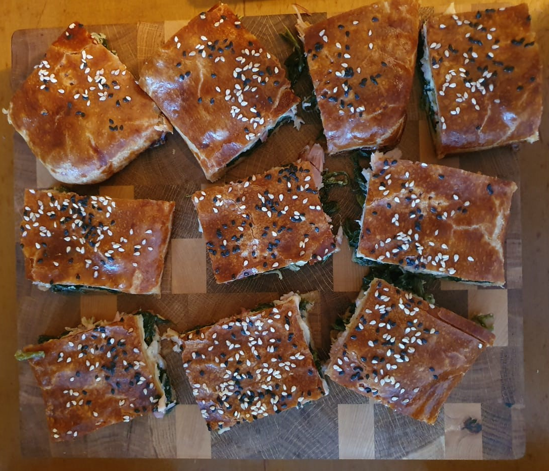 Фирменный пирог со шпинатом. Нам понадобится: - Слоеное тесто в пластинах (400гр); - Замороженный шпинат (лучше в листьях), можно и свежий, но его предварительно надо будет чуть-чуть обжарить; - Два окорочка копченой курицы (разобрать на волокна); - 350-400 гр. сыра (Можно разные сорта: Адыгейский, Российский, Моцарелла); - Две стволовые ложки сметаны или натурального йогурта; - Соль, перец; - Одно яйцо. Первым делом разморозить шпинат при компактной температуре, отжать его и разобрать. Добавить соль перец и сметану. Все перемешать. Раскатать пласт теста и выложить на него: Шпинат, затем курицу и сверху посыпать сыром. Для сочности на сыр сверху положить маленькие кусочки сливочного масла. Раскатать второй пласт теста и закрыть им пирог. Поверхность пирога смазываем яйцом, делаем небольшие проколы (чтобы выходил пар) и посыпаем семенами кунжута. Выпекать 40-45мин при температуре 180градусов. Пирог готов, нарезайте и подавайте к столу!
