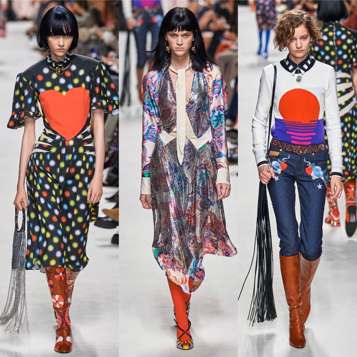 Paco Rabanne SS’20 RTW несколько психоделична, если не сказать безумна, как и положено указанному выше временному отрезку, когда умами молодежи управлял незыблемый принцип «мечтатель и реалист». Большое красное сердце в начале и конце коллекции - говорящий символ эпохи, когда всем правила любовь. All you need is love! “Для меня - это сила. Гордиться тем, что ты добрый и хороший человек. Разве не это ценно в наше время?» - говорит Доссена. - Я не знаю, насколько визуальная демонстрация имеет смысл, но это то, о чем я думал, создавая коллекцию». Фантастические образы, цветочный принт, пэчворк 70-х и рок-н-рол сделали эту коллекцию по-настоящему интересной. Доссена не просто обратился к ретро, он, как истинный новатор, создал что-то новое и неповторимое.