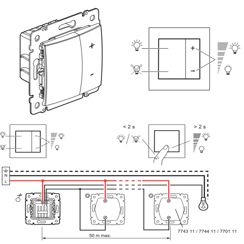 Проходные выключатели уже давно перестали быть чем-то необычным. Управление светом из разных мест проходных помещений уже давно считается нормой. Но совместимы ли диммеры с такими схемами управления светом? Если мы рассматриваем самые обычные диммеры, которые устанавливаются вместо выключателей, то нет. Они не совместимы с переключателями, так как работают как ключ в выключенном состоянии. Но конечно рынок не может отставать от современных тенденций, и выпущены специальные проходные диммеры, которые можно комбинировать с выключателями света. Но выключатели понадобятся непростые, а тактовые, которые возвращаются в начальное положение пружиной. Принцип их работы несколько отличается от обычных переключателей и напоминает кнопку. Выключатели замыкают фазу, которая подключается к диммеру. И выключатель начинает управлять диммером с помощью импульсов. Например, у серии Legrand Valena кратковременное переключение будет включать/выключать свет. А длительное зажатие включать режим изменения я