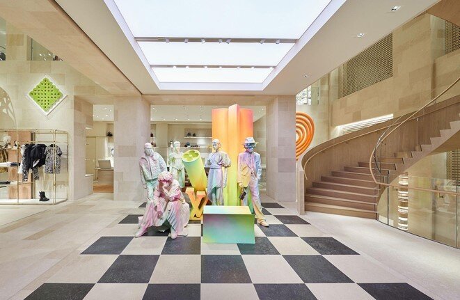 Световая конструкция расположена внутри бутика, над входными дверями. Однако ее можно установить и на стене. Она состоит из 4 панелей, которые меняют цвет и рисунок благодаря светодиодным пикселям. В качестве системы управления освещением используется модульная платформа Lumicloud Digital, созданная компанией TLS International. Панели побольше содержат 2860 полноцветных светодиодных пикселя, а панели поменьше — 1300. У каждого пикселя собственный DMX-контроллер. Каждая панель по конструкции напоминает светящиеся натяжные потолки, потому что представляет собой светодиодную матрицу, которая скрыта ПВХ-пленкой, равномерно рассеивающей свет. Матрица состоит из ряда узких плат с полноцветными светодиодными пикселями. Платы соединены подвесными гибкими кабелями, поэтому матрице можно придать любую форму. Также у матрицы имеется светоотражающая подложка. Она защищает ее от пыли и повышает светоотдачу на 15 процентов. Световая конструкция устанавливается просто и быстро благодаря системе