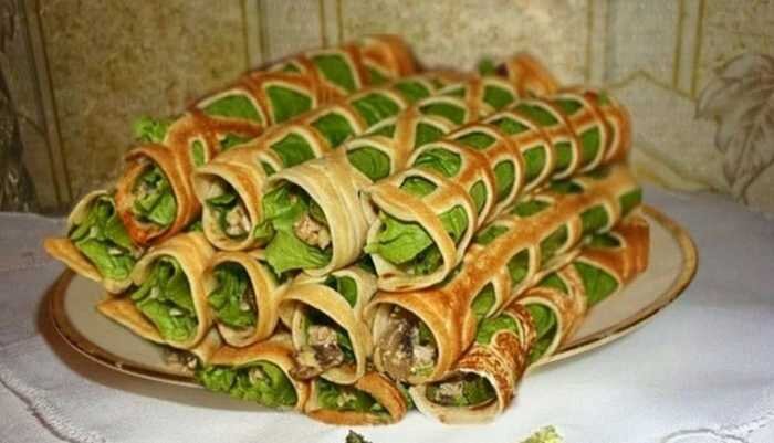 Также можно «нафаршировать» ажурные блины твердым сыром, овощами и другими начинками на ваш вкус. К примеру, можно сделать пасту из мягкого сыра и чеснока. Выложить на блин лист салата и намазать сырной начинкой.