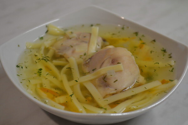 Куриная лапша - это очень вкусный, легкий, полезный супчик. Его любят и взрослые, и дети. ----- Нам понадобится: ----- Куриные бедра помыть прохладной водой, срезать кожу и лишний жир. Разрезать каждое на два-три кусочка. В трехлитровой кастрюле вскипятить воду, положить курицу, варить сорок минут на небольшом огне. Вода должна немного булькать, не бурлить. В начале варки надо снять накипь шумовкой или большой ложкой. Если этого не сделать, через некоторое время она опустится и будет плавать в супе неаппетитными хлопьями. Некоторые хозяюшки даже процеживают готовый бульон. Лук мелко нарезать, добавить в кастрюлю, варить две минуты. Морковь натереть на крупной терке или мелко нарезать, добавить в кастрюлю, варить пять минут. Суп посолить, поперчить по вкусу. Добавить лапшу. Я обычно покупаю яичную. Можно ее поломать на несколько частей, так будет удобнее есть. Варить две минуты. Суп хорошенько перемешать, чтобы лапша не слипалась, убрать с огня. По желанию можно посыпать свежей м