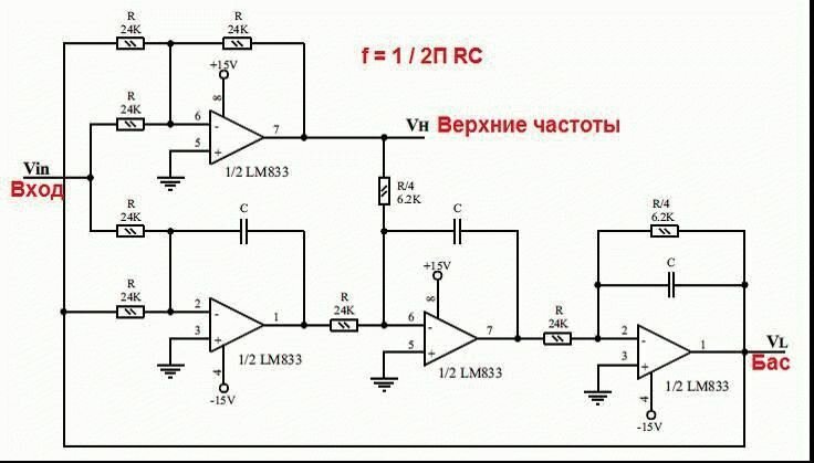 Следующим вопросом будет фильтр. Полагаем, фирма National Semiconductor не обидится, если отскриним чертеж усилителя перевода Ридико. Рисунок показывает активный фильтр с питанием +15, -15 вольт, 5 однотипных микросхем (операционных усилителей), граничная частота поддиапазонов вычисляется формулой, приведенной на изображении (дублируем текстом):