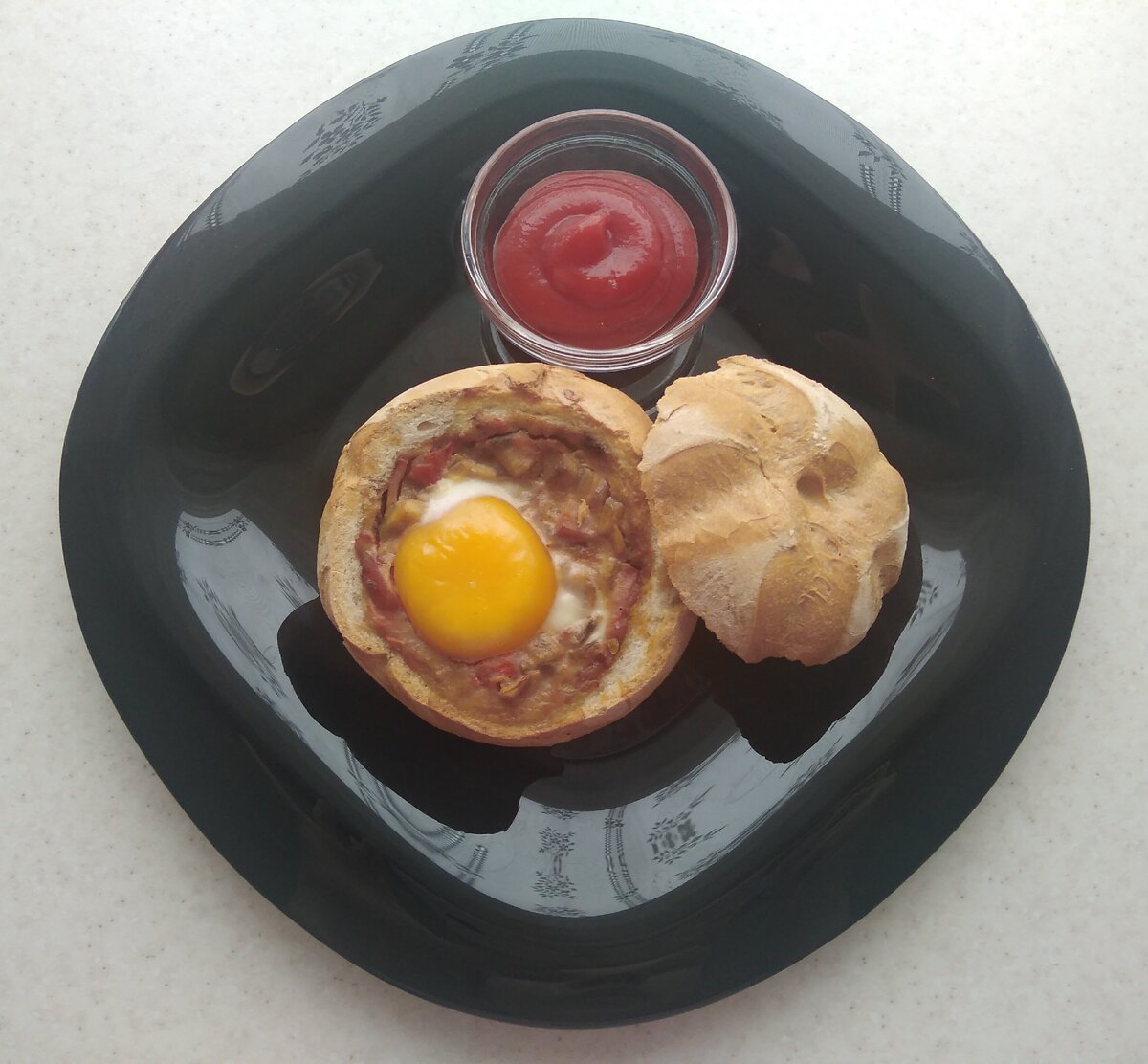 просто отличный вариант, а если она еще и со вкусной начинкой внутри, то это просто великолепно! Такой завтрак хорошо делать в субботнее утро, когда никуда не торопишься. Аромат этих булочек поднимет и соберёт всю семью за общим столом в выходной день, что подарит всем доброе утро! точный и подробный список ингредиентов вы найдете в конце статьи 1. Мелко нарезаем все ингредиенты: сосиска, лук, грибы, помидор. 2. У яйца отделяем желток от белка. Все порезанные овощи и сосиску отправляем на разогретую сковороду, солим, перчим. Выливаем туда же белок и хорошо всё перемешиваем. Жарим 5 минут. 3. Пока жарится начинка у булочки срезаем верхнюю часть и вынимаем мякиш. 4. Выкладываем всю начинку в булочку. 5. В серединке начинки сделать углубление, и в него вылить желток. Отправить запекаться в предварительно разогретую духовку до 180° минут на 10-15, пока желток не схватится. Степень приготовления желтка контролируйте сами, к