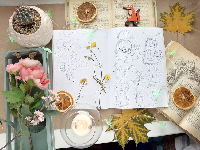 В конце марта в Казани состоится выставка авторских кукол и игрушек. Тема выставки "Сказки старого города". Я подала заявку на участие и теперь нахожусь в процессе приятных хлопот. С чего начинается подготовка к выставке? 1. Тема стенда. Я для себя определилась - моя сказка будет ботаническая)) Зарисовываю образы, которые первыми приходят в голову: Помимо персонажей заодно продумываю оформление стенда - будет много цветов, какие-то ботанические иллюстрации, сухоцветы, кашпо и т.д.. И вот, первый представитель моего весеннего сада - мишка в костюме пчелы. Любая кукла начинается с эскиза - рисую: 2-3 свободных вечера и готов малыш: Да, в процессе игрушка может диктовать свои условия и не всегда похожа на эскиз, но тем не менее без эскиза никак.