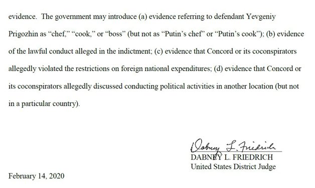 Известно, что Пригожина подозревают во вмешательстве в американские президентские выборы 2016 года. Однако окружной суд Колумбии своим решением от 14 февраля 2020 года постановил, что упоминать бизнесмена как «повара Путина» неправомерно. Кроме того, это словосочетание запрещено использовать в деле против возглавляемой бизнесменом компании «Конкорд Менеджмент и Консалтинг».