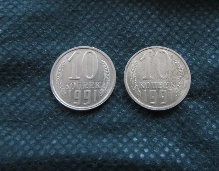 В 1991 году в последний раз были отчеканены монеты страны под названием СССР. В их числе были и монеты номиналом 10 копеек. Если вспомнить те цены, которые вдруг резко выросли, то остается непонятным - зачем вообще эти монеты в 1991 году чеканили, если на них толком ничего и купить нельзя было. Да и тиражей предыдущих лет вполне хватало для обращения. Но как бы то ни было, монеты номиналом 10 копеек в 1991 году были отчеканены большим тиражом. При этом монеты 1991 года получили новшество. На аверсах под гербом СССР стали указывать букву монетного двора - или М (Московский), или Л (Ленинградский). Таким образом, монета в 10 копеек существует, как минимум, в двух вариантах по знаку монетного двора. Нумизматическая ценность монеты 10 копеек 1991 года сегодня примерно равняется нулю рублей. Никому эти монеты не нужны даже даром. Обоих монетных дворов. В ценниках иногда указывают стоимость, типа, 1 рубль, или 5 рублей, но это чисто условно, чтобы можно было представить разницу между цена