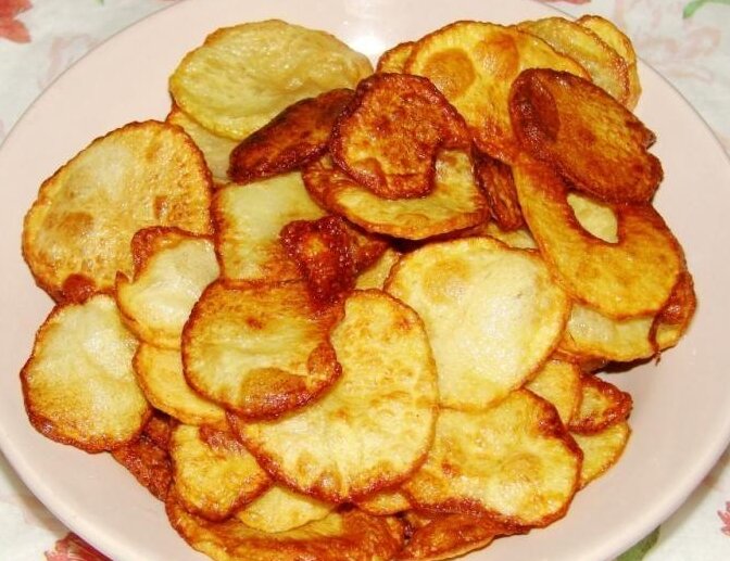 ИНГРЕДИЕНТЫ Шаг 1 1. Картофель хорошенько промойте щеточкой и нарежьте тонкими ломтиками Шаг 2 2. Если время позволяет, то залейте порезанный картофель водой и добавьте 3 столовые ложки соли. Оставьте на полчаса. Затем просушите. Если времени нет, то ничего и не делаем, посолим уже готовые чипсы. Шаг 3 3. В глубокую сковороду влейте масло. Оно должно заполнять сковороду на 2,5 см от дна. Хорошенько разогрейте на большом огне. Нужную температуру можно проверить двумя способами. Вкиньте маленький кусочек хлеба, он должен стать золотисто-коричневым через 10 секунд. Либо вставьте деревянную ложку, должны пойти пузырьки. Шаг 4 4. Жарьте картошку в масле небольшими порциями до золотисто-рыжего цвета. Шаг 5 5. Каждую партию выкладывайте на слой бумажных салфеток, чтобы избавиться от излишков масла. Шаг 6 6. Готовые картофельные чипсы посыпьте любимыми специями или солью (если вы картофель не замачивали) и подавайте. Приятного аппетита! Такие чипсы уж точно не уступают лейсу,