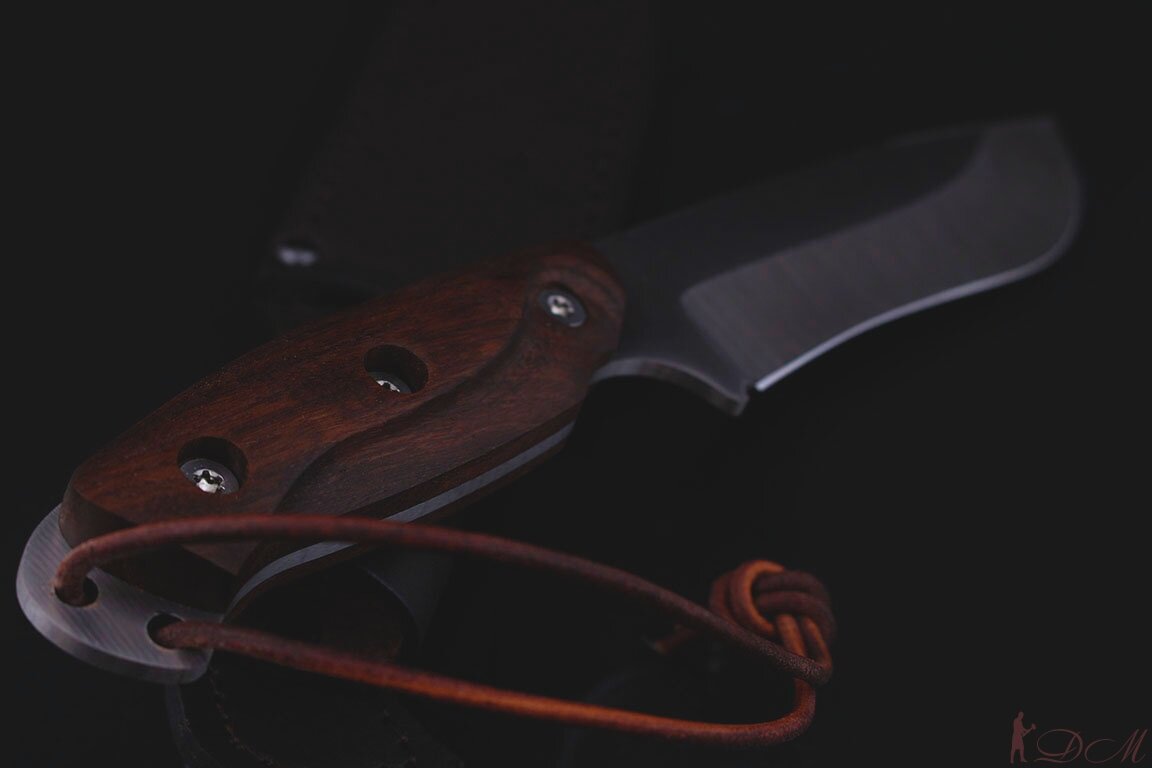 - Клинок откован из высокопрочной инструментальной штамповой стали Российского производства х12мф. Данная сталь используется для изготовления изделий сложных форм с высокой вязкостью и механической прочностью . Спуски клинка выполнены в виде вогнутой линзы по технологии изготовления опасной бритвы и начинаются с середины клинка, что придает ножу универсальную геометрию для рубяще-режущих работ. Толщина сведения режущей кромки 0,4 - 0,5мм.