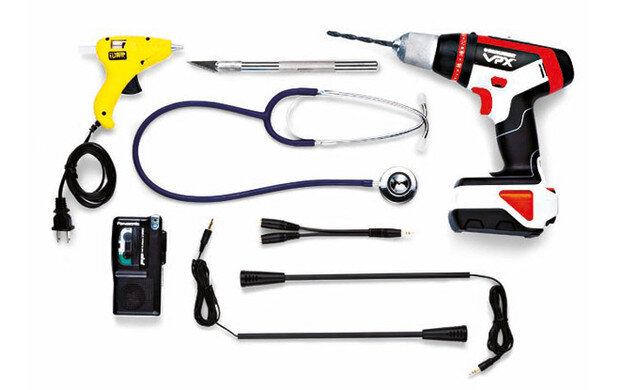 █ Развивающаяся паранойя Шаг 1 Для начала возьми микрофоны и вынь их из жесткого корпуса с помощью строительного ножа. Только не перережь провода — для чего-то же они нужны! Шаг 2 Возьми стетоскоп и дрель. Просверли пару дырок в полу. Класс? Теперь немного рассверли насадки для ушей — ровно на такую ширину, чтобы в них легко вошли освежеванные микрофоны. Раз, два! Шаг 3 Настало время для клея. Нанеси на микрофоны пару капель клея и вставь их в рассверленные отверстия стетоскопа. Плотно прижми и подержи так пару