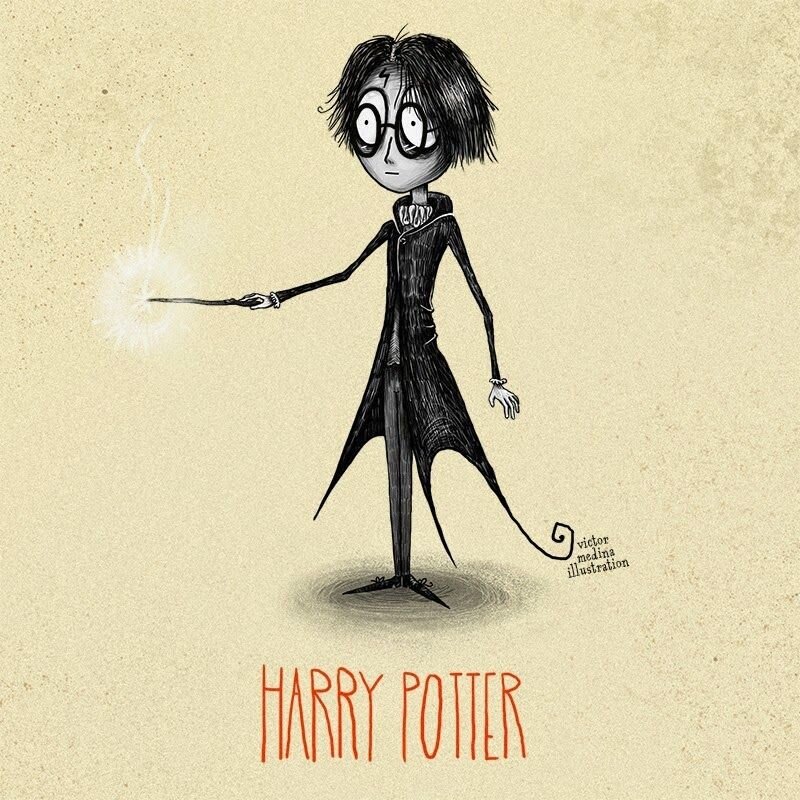 Как уже было понятно из заголовка, речь пойдет об иллюстрациях, связанных с "Гарри Поттером" и Тимом Бертоном. Что же может быть интересного в этом тандеме? Ну, как минимум то, что данный режисер прославился своим мрачным почерком при создании героев для своих фильмов и мультиков.