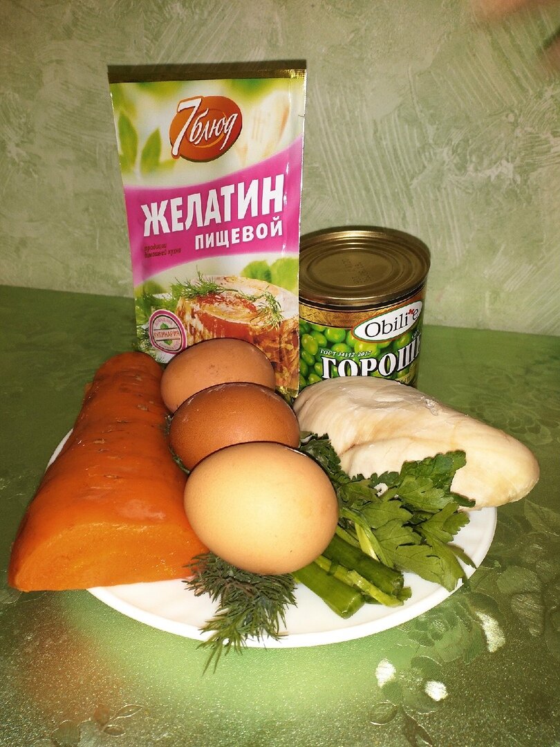 Всем привет!!! Готовим добротное заливное. Нам понадобиться: 1. Желатин 20 гр. 2. Зеленый горошек 1/2 банки 3. Яйца 4 шт 4. Куриная грудка 300 гр. 5. Морковь 150 гр. 6. Зелень ассорти (лук,петрушка,укроп) 7. Куриный бульон 600 мл. Способ приготовления: 1. Куриную грудку отвариваем до готовности (бульон оставляем, в дальнейшем он пригодиться). 2. Морковь с яйцами отвариваем отдельно. 3. Берем форму, у меня маленькой нет,поэтому я использую большую из микроволновой печи. 3. Все заливаем желатином и ставим в холодильник на 3 часа 4. Как приготовить желатин Для этого нужно в глубокую тарелку налить 60 мл воды и засыпать желатин 20 гр (у меня 2 пакетика по 10 гр) и оставить на 10-20 мин., чтобы желатин набух. Куриный бульон, в котором мы отваривали грудку, доводим до кипения, нужно 600 мл. Убираем с плиты и заливаем желатином, перемешиваем, даем настояться еще 10 мин. Приятного аппетита!!! Поставьте лайк, если вам понравился рецепт. Подписывайтесь на мой канал и ждите новых рецептов!