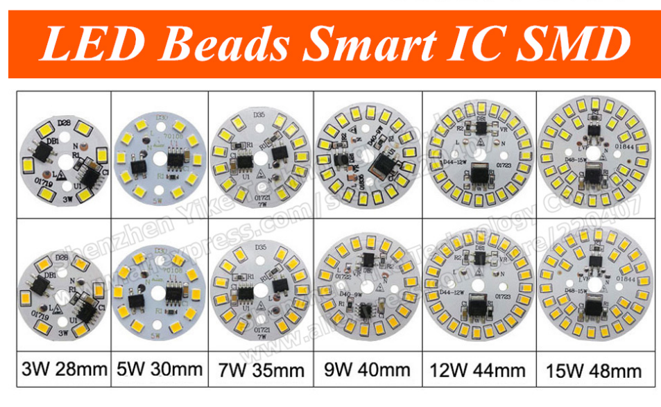 Этот светодиодный источник света для светодиодных ламп, драйвер уже установлен на плате. сразу подключаешь к 220 вольтам. купить на aliexpress 220 В led pcb SMD2835 3 Вт 5 Вт 7 Вт 9 Вт 12 Вт 15 Вт интегрированный ic драйвер, Старый снимаешь со всеми схемами, новый ставишь на его место припаяв провода сразу на цоколь, ну просто супер. По цене выходит одна замена лампы 75р на 15Вт как (130Вт) лампа накаливания. Главное увеличился срок службы. Упаковка включает: 10 шт. 220в светодиодная плата PCB Характеристика: 1. Входной AC170-275V, без необходимости драйвера 2.Используйте чип 2835 epistar, отличное качество и долгий срок службы 3. Интегрированная технология ИС без электролитических конденсаторов и трансформаторов более длительный срок службы 4. Продукты маленькие, что обеспечивает большую гибкость и более творческий дизайн освещения 5. Коэффициент высокой мощности (> 80%) и низкое полное гармоническое искажение легко через сертификацию EMC 6. Эффективность преобразования энергии