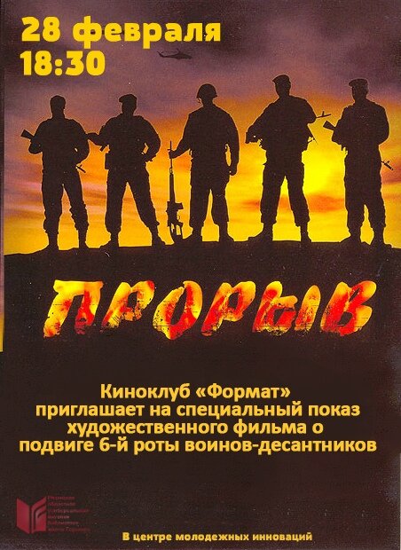 29 февраля 2000 года в Аргунском ущелье рота псковских десантников ценой собственной жизни не пропустила в мирные города и села огромный отряд боевиков Хаттаба и Басаева, имевший почти тридцатикратное численное превосходство. 90 солдат российской армии сознательно приняли бой, от которого могли уклониться. Когда силы были уже на исходе, уцелевшие бойцы вызвали огонь артиллерии на себя и бросились в рукопашную схватку. Ждем всех на просмотр и обсуждение фильма 28 февраля в 18:30 в Центре молодежных инноваций.